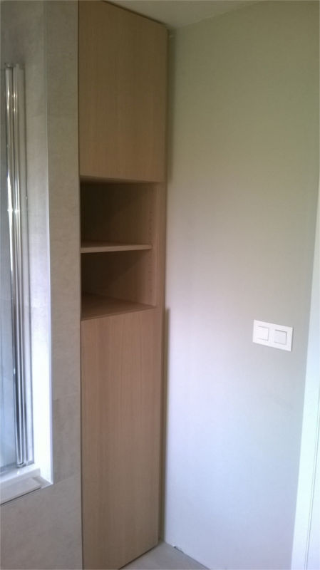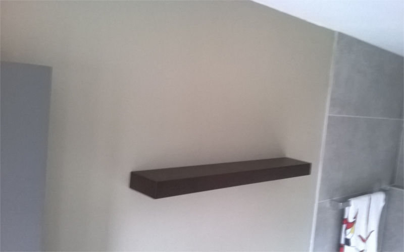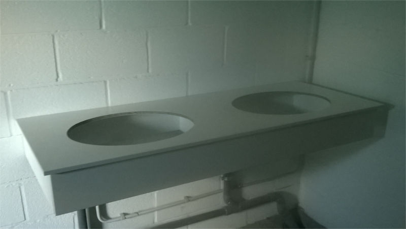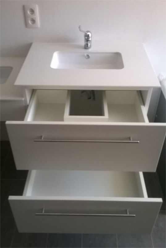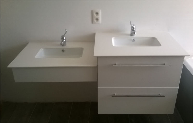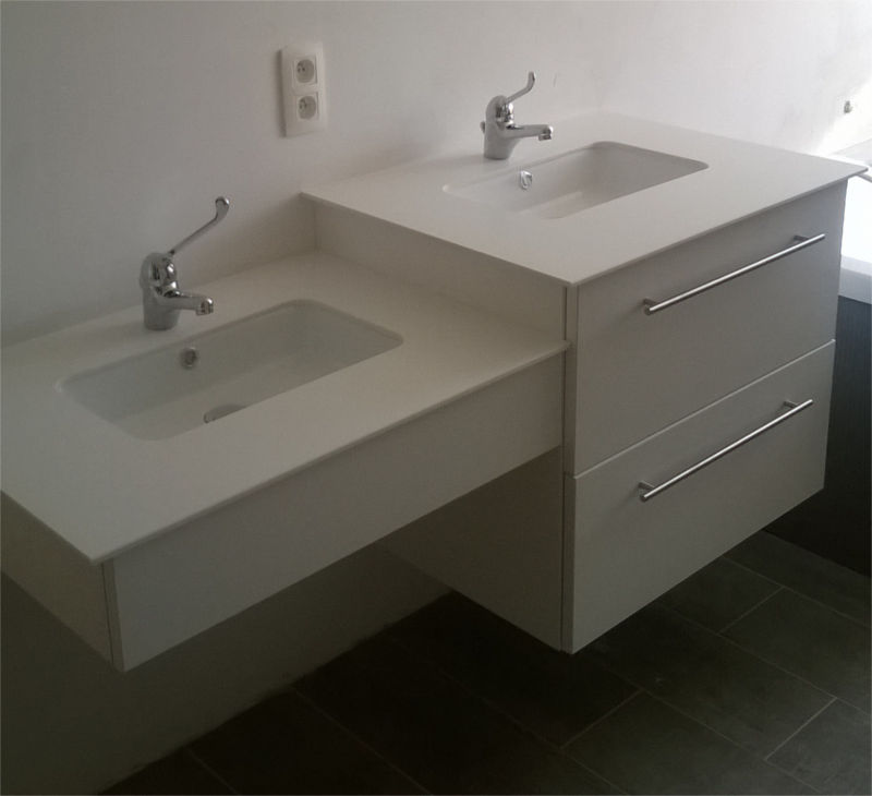 Meuble lavabo suspendu en stratifié blanc avec partie pour personne à mobilité réduite