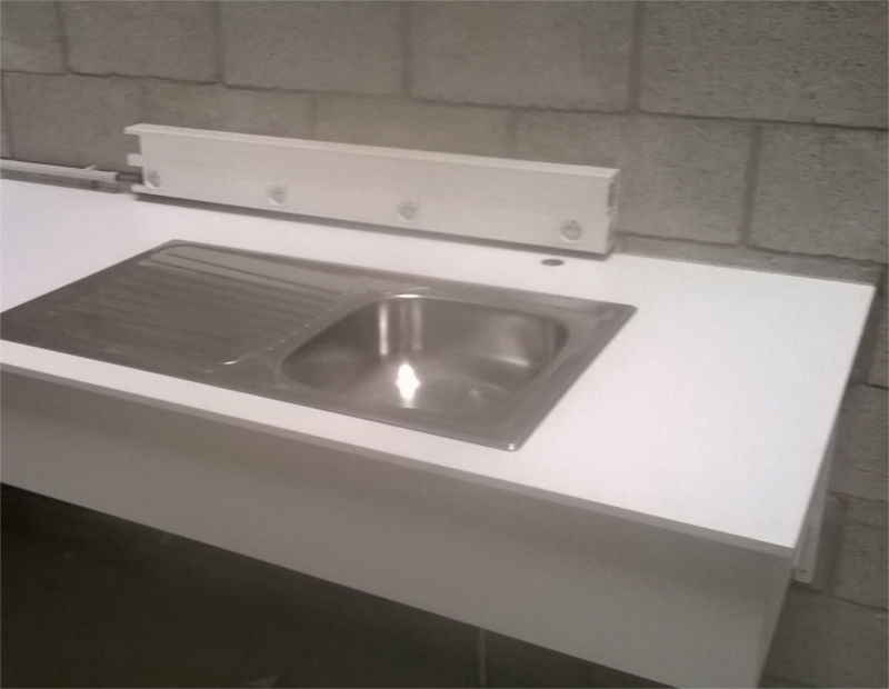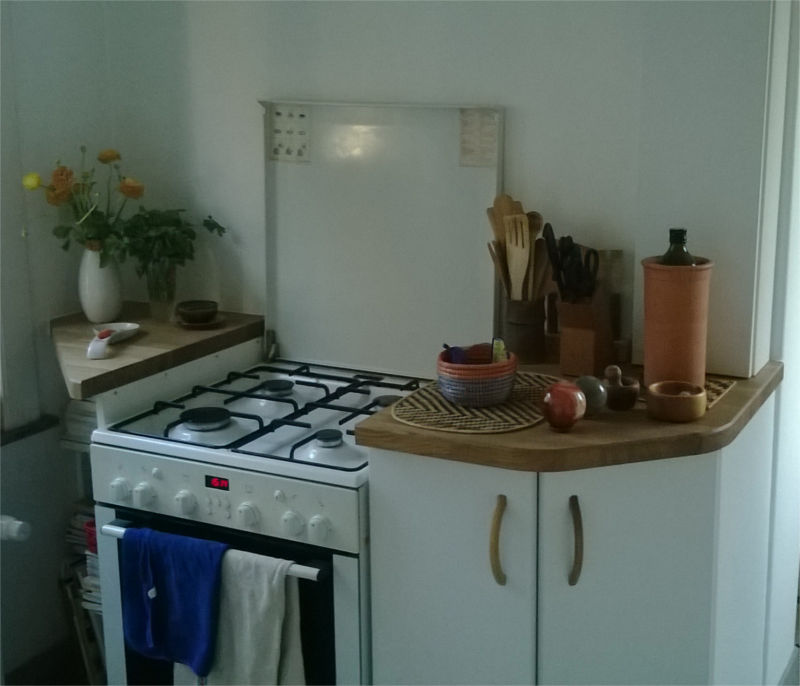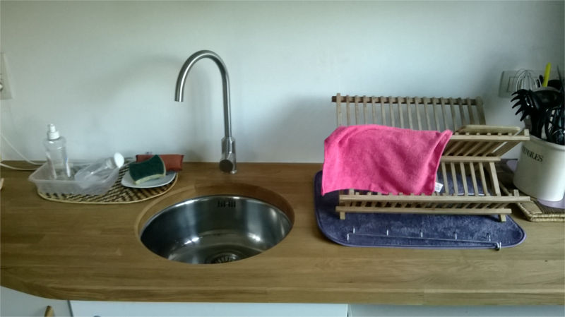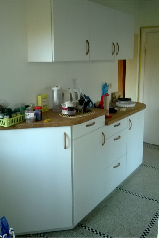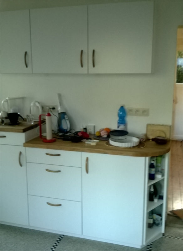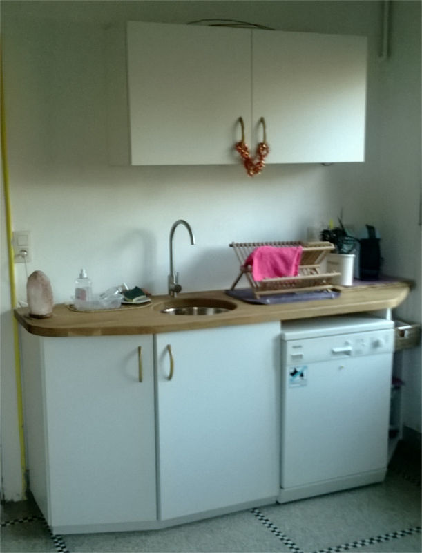 Cuisine en stratifié blanc, plan de travail en lamellé-collé chêne