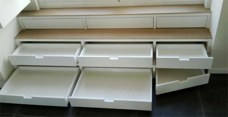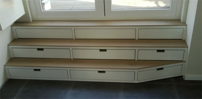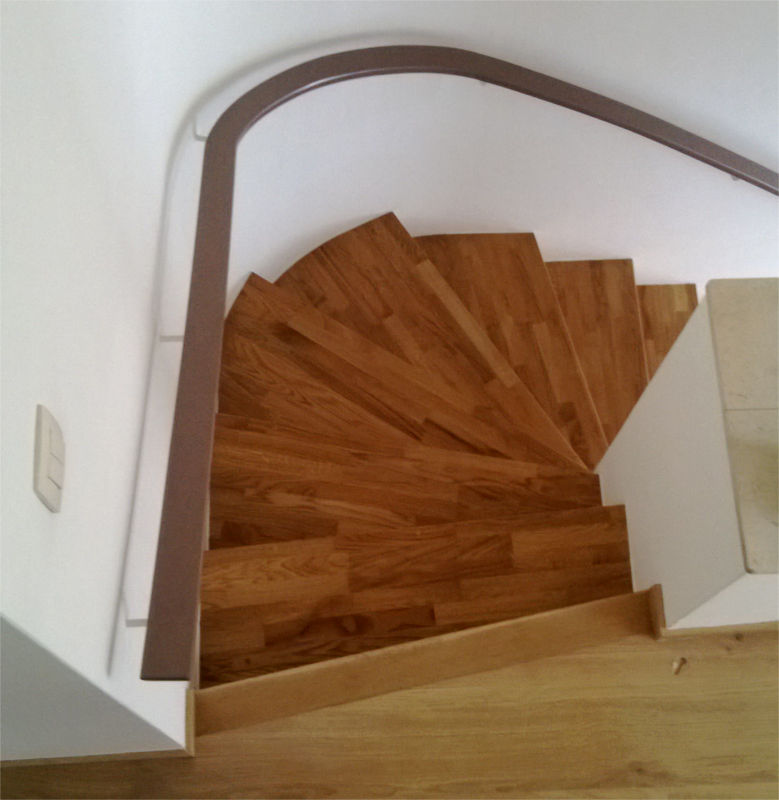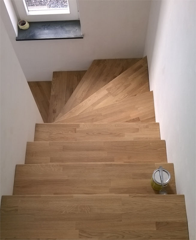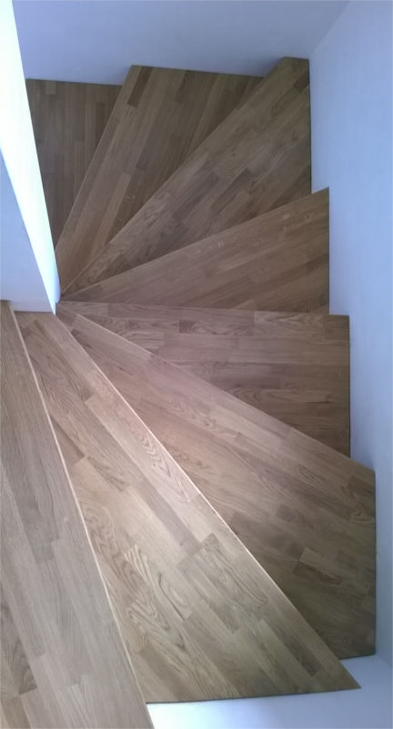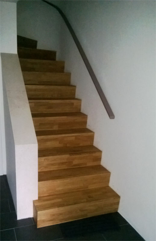 Couverture d'escalier en chêne lamellé-collé, sans nez de marche, contre-marches en oblique